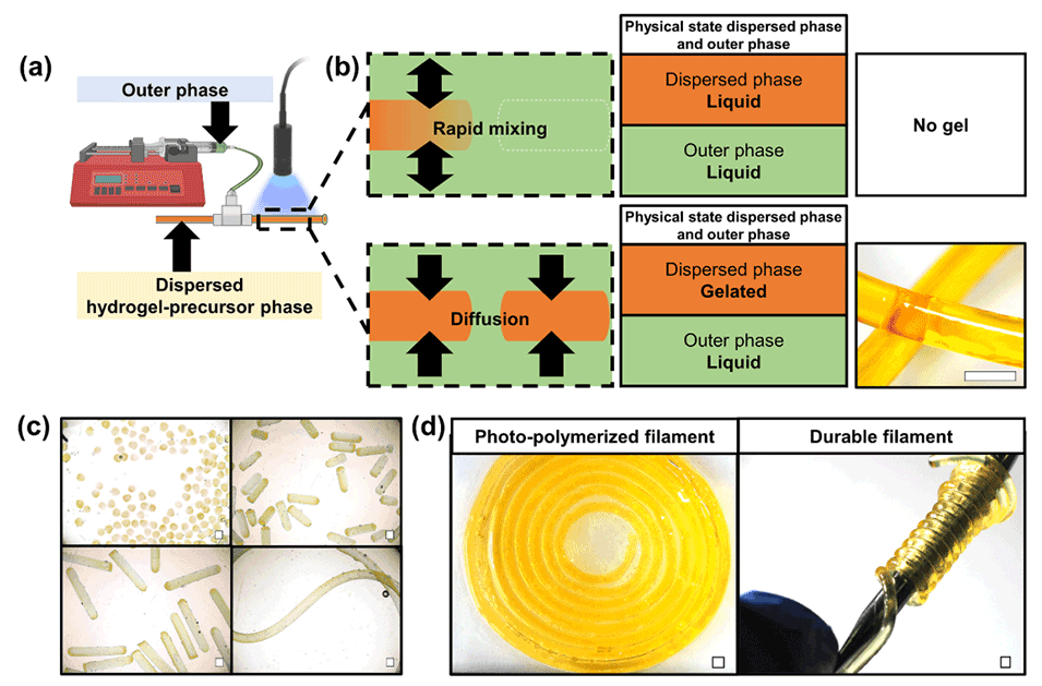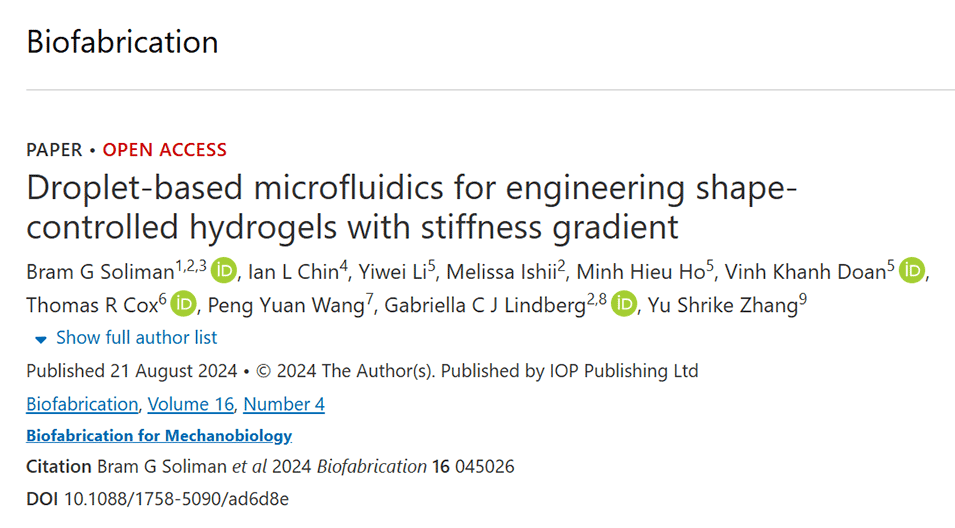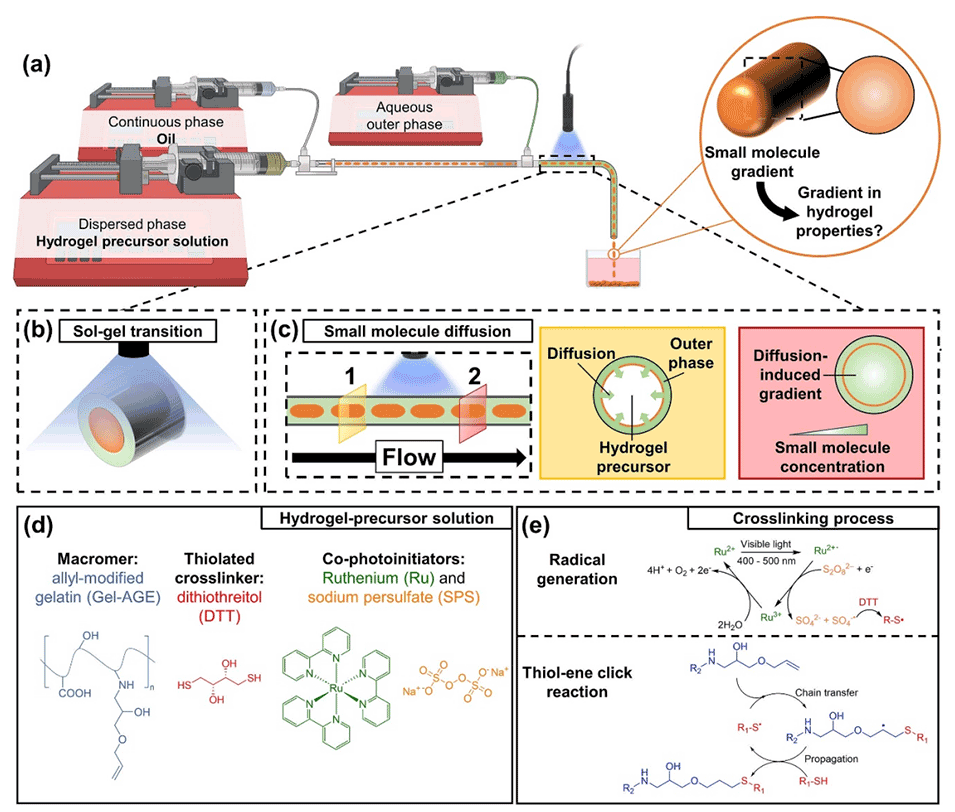 生物制造中的微流控技术可以精确控制水凝胶的形状和尺寸,但在制造具有微观空间异质性的水凝胶方面仍存在局限性。近期,有研究人员提出了一种基于扩散的新型微流控平台,通过两步法实现了形状可控且具有刚度梯度的水凝胶的制备。该技术可用于组织工程中模拟天然组织的形状-功能关系,并研究细胞对刚度异质性的反应。相关研究以“Droplet-based microfluidics for engineering shape-controlled hydrogels with stiffness gradient”为题目,发表在期刊《Biofabrication》上。