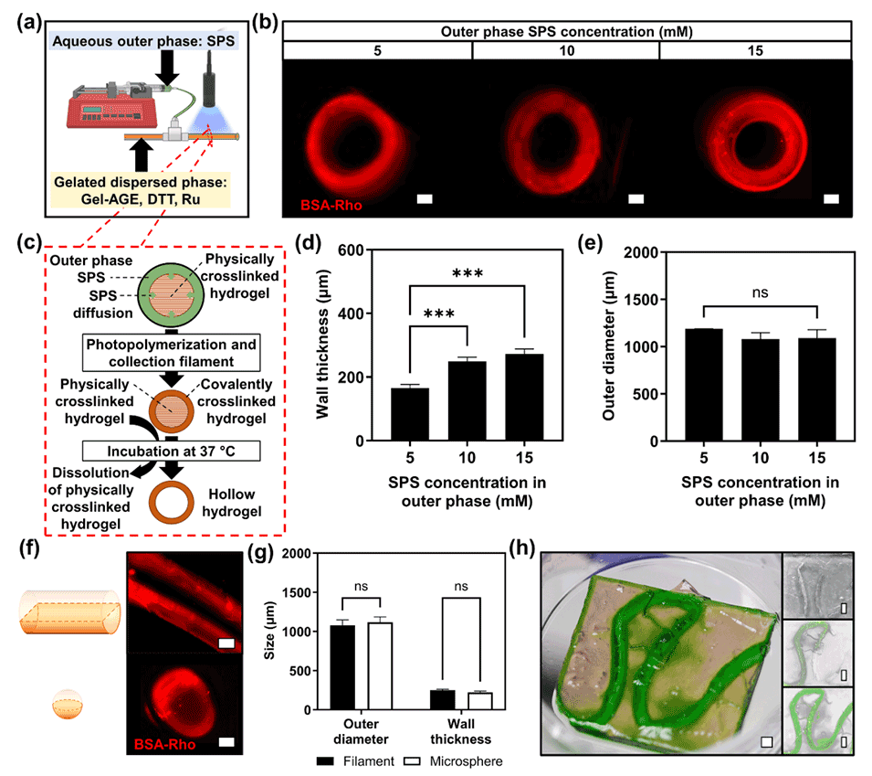 2、通过调节小分子(如过硫酸钠)的扩散速率,可以精细调控水凝胶的微观结构,包括刚度梯度的强度和范围,以及中空结构的壁厚。