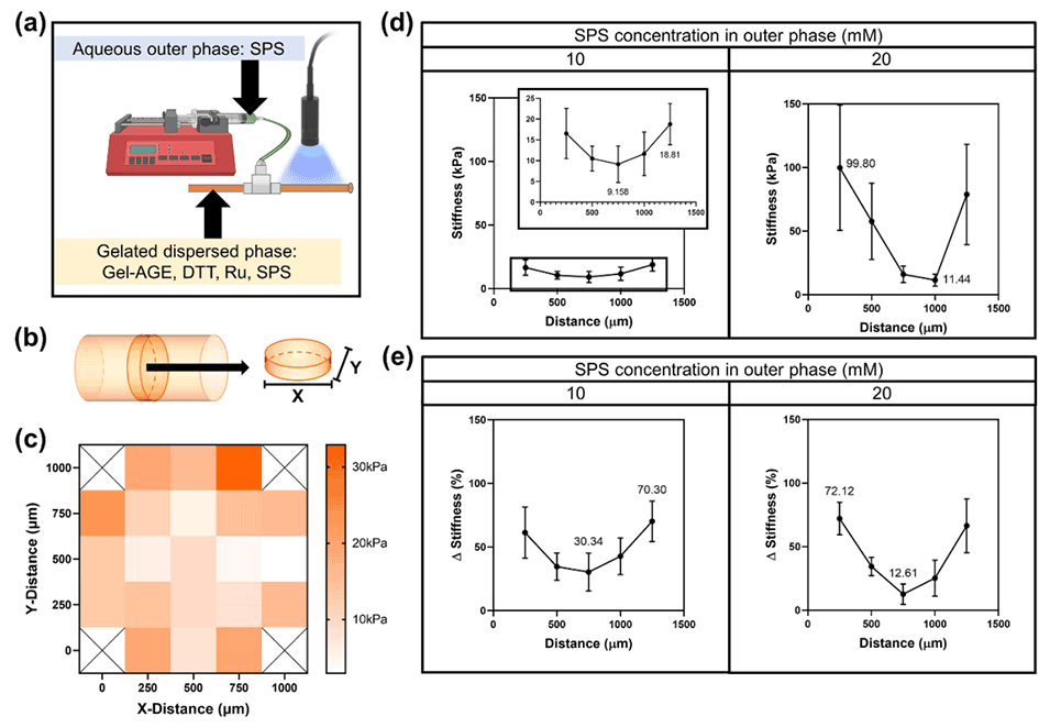 图3.通过基于扩散的微流体技术制备的水凝胶丝横截面的力学特性。