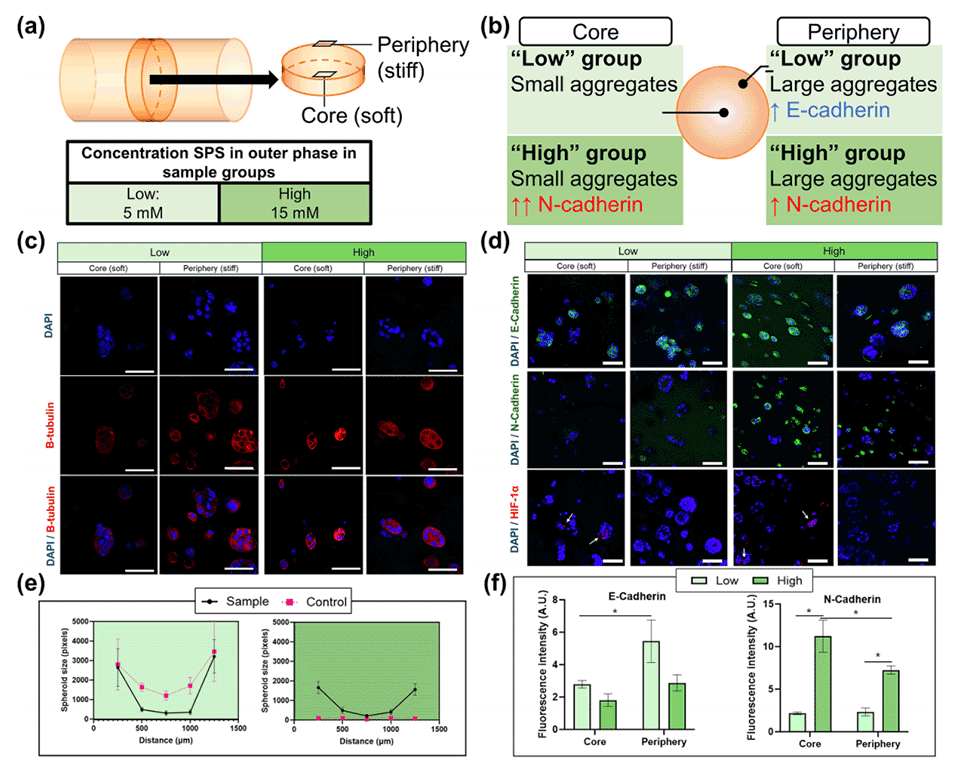 1、提出了一种新的“扩散驱动微流控”技术,可以在微流控平台上制造出具有可控形状和尺寸的水凝胶,同时在水凝胶内部形成径向刚度梯度和中空结构。