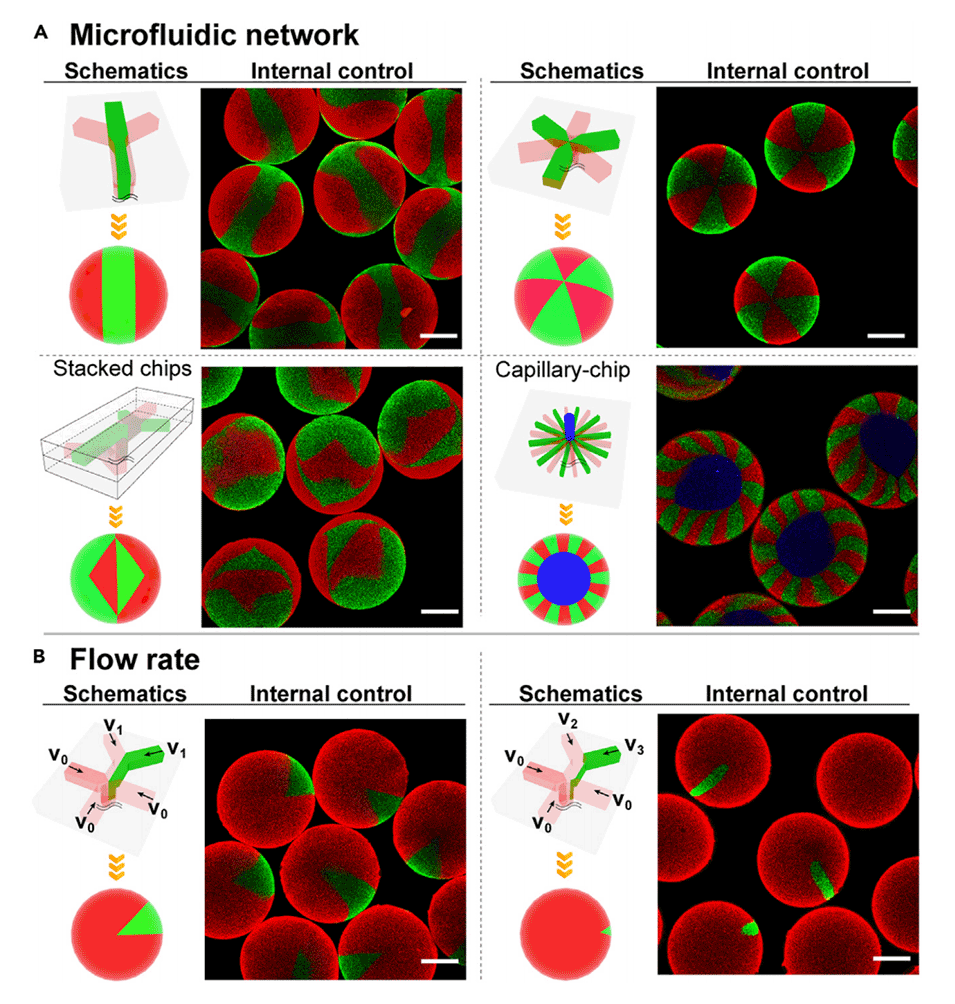 图3.可通过改变微流控网络和流速来调整区室化微粒的内部布局