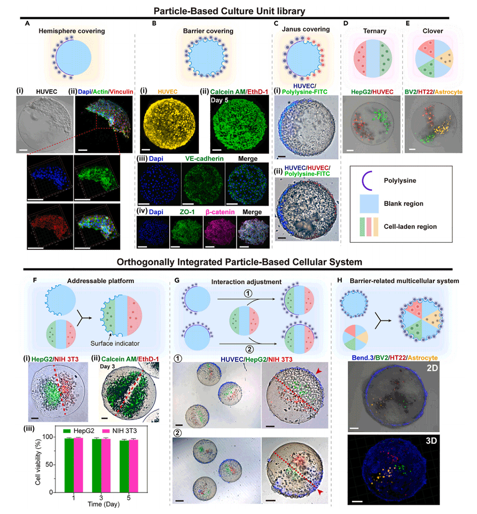 4、此外,还探索了微粒作为新型细胞载体的潜在应用,成功在微粒表面和内部建立了图案化细胞培养体系。