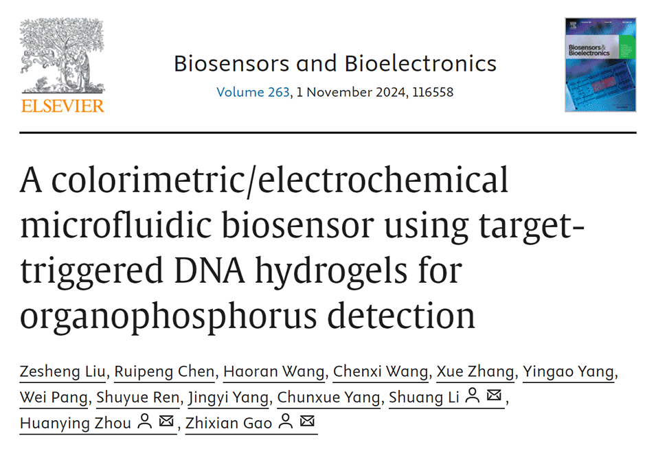 有机磷化合物广泛分布于土壤和水体中,对环境和生物体具有高度毒性。目前,有机磷化合物的检测主要依赖于单一模式,这使得同时实现良好的便携性、准确性和灵敏度存在挑战。近期,军科院军事医学研究院高志贤研究员、周焕英研究员、李双等人设计了一种基于目标触发DNA水凝胶修饰微流体的生物传感器,实现了对有机磷化合物马拉硫磷的比色/电化学双模式检测,其具有便携性、高灵敏度和良好选择性,为现场检测有毒有害物质提供了一种简单而准确的新方法。相关研究以“A colorimetric/electrochemical microfluidic biosensor using target-triggered DNA hydrogels for organophosphorus detection”为题目,发表在期刊《Biosensors and Bioelectronics》上。