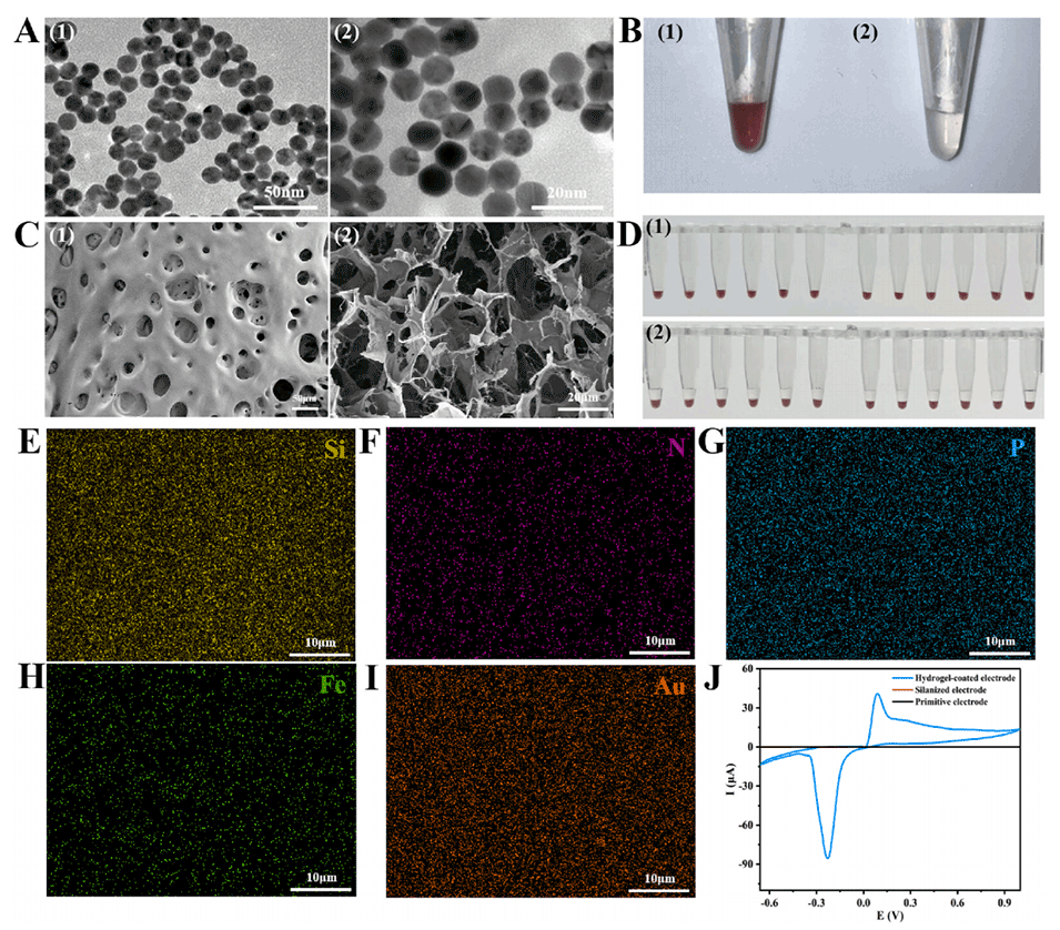 图1:(A)金纳米粒子(AuNPs)的表征,包括不同放大倍数下的透射电子显微镜(TEM)图像,显示了AuNPs的均匀分散和尺寸;(B)DNA水凝胶的表征,含AuNPs的水凝胶呈酒红色,不含AuNPs的水凝胶为透明色;(C)DNA水凝胶表面和横截面的扫描电子显微镜(SEM)图像;(D)不含上清液和含上清液的批量合成DNA水凝胶;以及(E-I)DNA水凝胶固定ITO电极表面Si、N、P、Fe和Au的分布。(J)原始、硅烷化处理和水凝胶涂层ITO电极的循环伏安(CV)曲线。