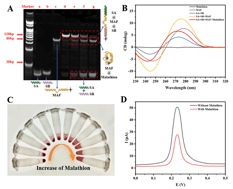 图3:(A)展示了非变性聚丙烯酰胺凝胶电泳(PAGE)的图像,用于验证MAF(马拉硫磷适配体)与马拉硫磷和SA、SB的竞争结合能力;(B)圆二色谱(CD),用于展示MAF、SA和SB的二级结构变化;(C)DNA水凝胶上清液随马拉硫磷浓度增加的颜色变化;以及(D)有无马拉硫磷时DNA水凝胶传感器的差分脉冲伏安法(DPV)曲线。