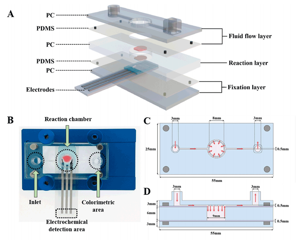 图2:(A)微流控芯片结构展开图。(B)基于组装比色/电化学双模式目标触发DNA水凝胶的微流控生物传感器。(C)微流控芯片俯视图。(D)微流控芯片的纵向剖面图。