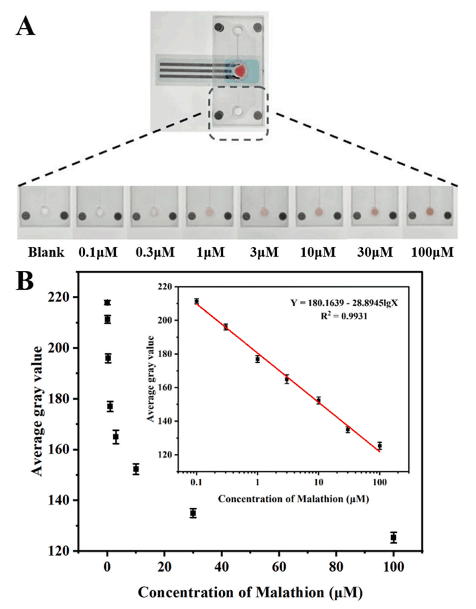 图5:(A)用智能手机对比色检测区域的上清液进行拍照;以及(B)平均灰度值与马拉硫磷浓度对数的关系图。