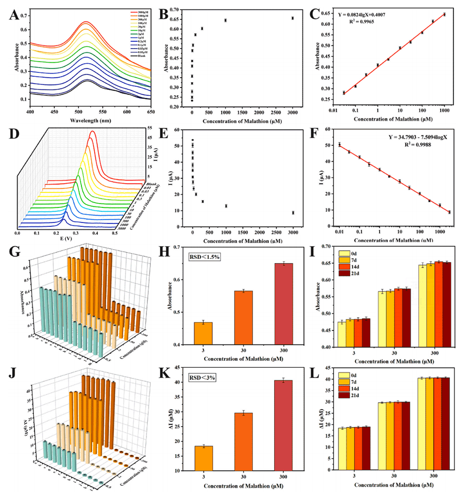 图4:(A)展示了不同浓度马拉硫磷标准溶液与DNA水凝胶生物传感器反应后的上清液的紫外-可见吸收光谱;(B)吸光度与马拉硫磷浓度的关系及(C)检测曲线;(D)与不同浓度马拉硫磷反应时DNA水凝胶的DPV曲线;(E)DPV峰电流变化与马拉硫磷浓度的关系及(F)检测曲线;以及(G-L)该双模式生物传感器对马拉硫磷检测的特异性、重复性和稳定性分析。
