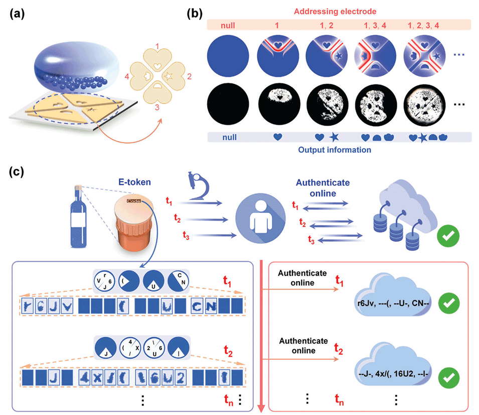 1、动态电子令牌(E-token):eMAPDA平台通过使用可寻址的多电极技术,在单个微滴内编码和显示多种信息,创建出能够展示动态变化信息的电子令牌。这种动态信息显示能力极大地增强了产品的防伪特性。