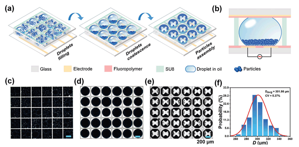 4、电场参数调节:调整交流电信号的幅度和频率,控制粒子在液滴内的组装行为,形成特定的微图案。