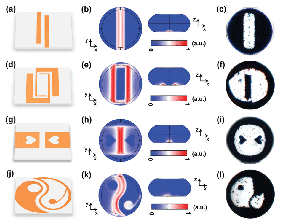 3、介电泳力操控:应用介电泳原理,根据粒子和介质的电性质差异,通过非均匀电场驱动粒子组装。