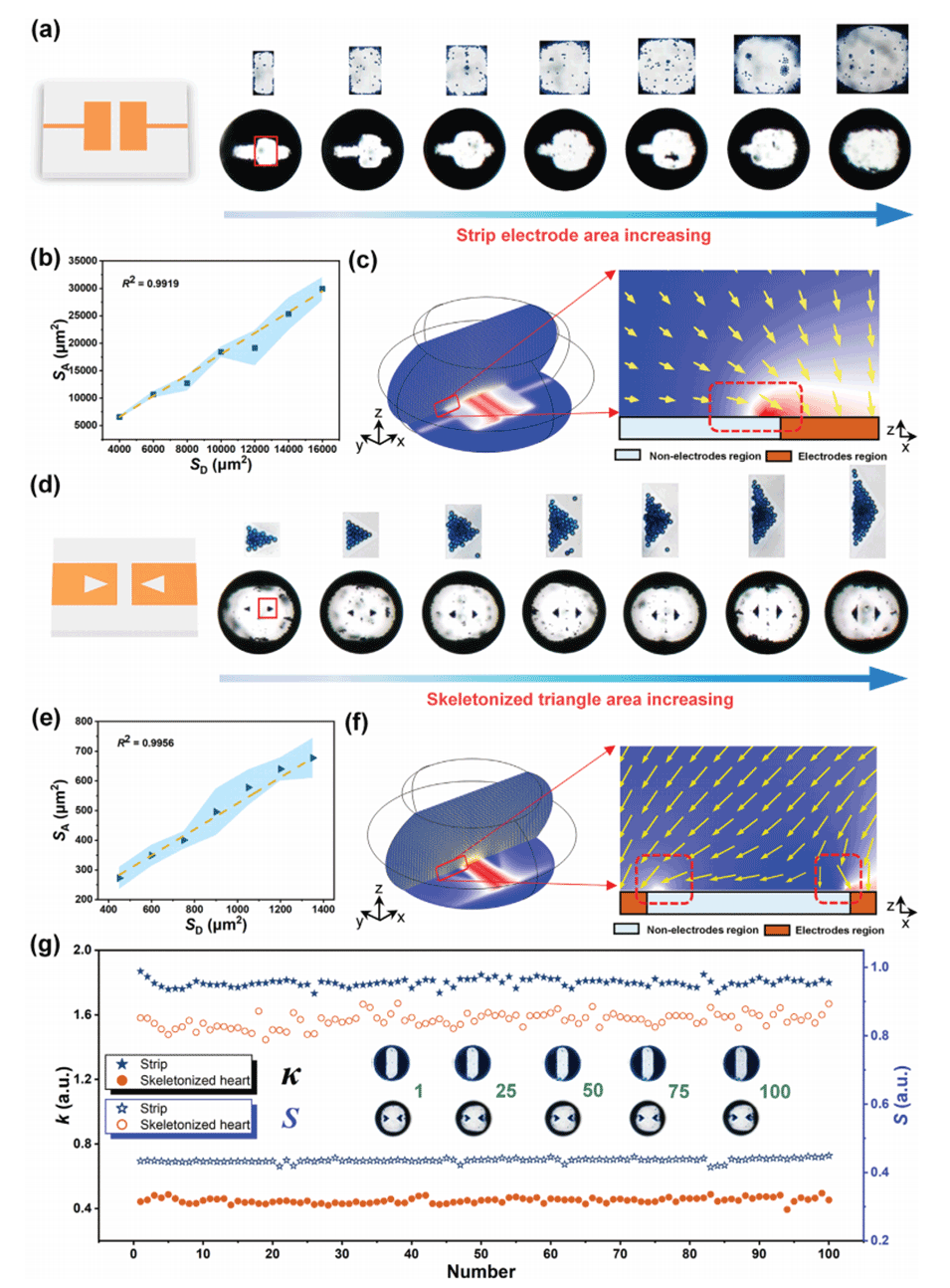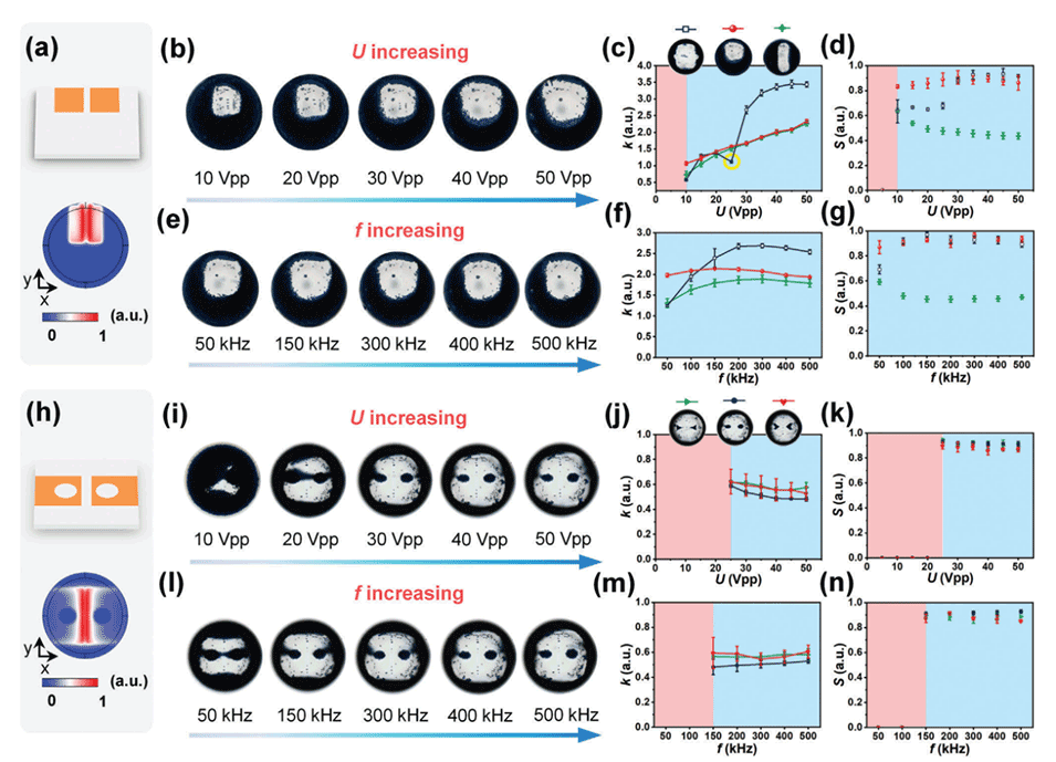 图4.电极形态对液滴中组装可调性和稳健性的影响。