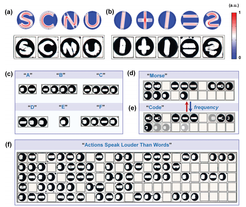 3、在液滴阵列中成功组装了字母、数字和摩尔斯电码图案,展示了编码信息的可行性和可扩展性。