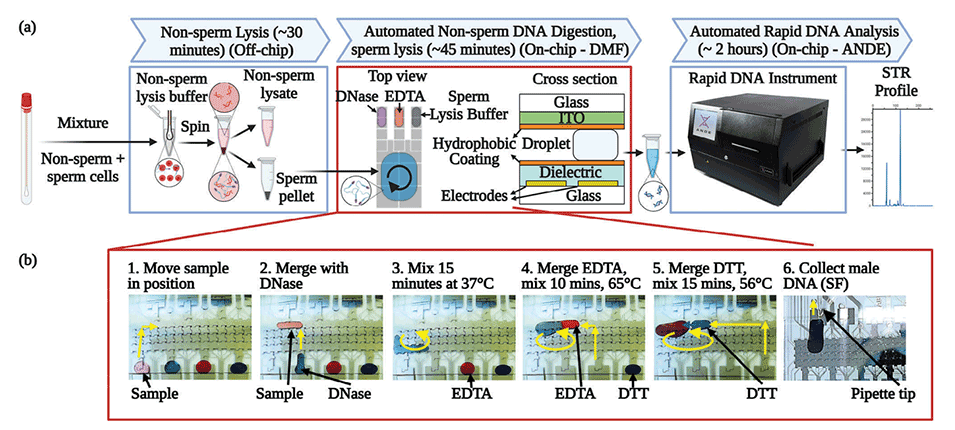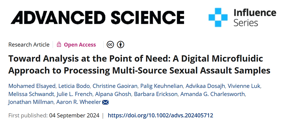 近期,加拿大多伦多大学Aaron R. Wheeler教授团队开发了一种利用数字微流控技术辅助的差异消化方法,用于自动化处理性侵犯样本中的多源DNA,该方法能够与快速DNA分析系统兼容,为实验室外的性侵犯样本分析提供了一种潜在的现场快速检测手段。相关研究以“Toward Analysis at the Point of Need: A Digital Microfluidic Approach to Processing Multi-Source Sexual Assault Samples”为题目,发表在期刊《Advanced Science》上。