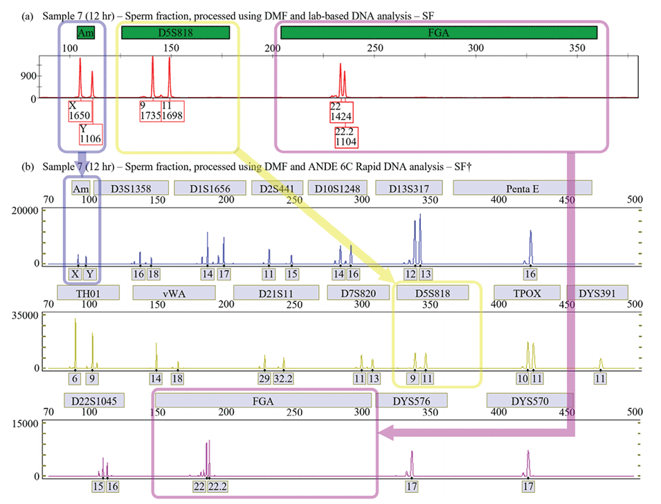 图3.通过标准实验室分析技术和快速DNA分析法对样本7(性交后12小时采集的阴道拭子)进行的代表性电泳分析。