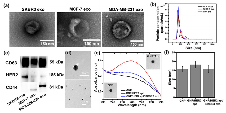 图2.(a)来自SKBR3、MCF-7和MDA-MB-231细胞系的癌细胞衍生外泌体的负染色TEM图像。(b)通过NTA获得的SKBR3外泌体、MCF-7外泌体和MDA-MB-231外泌体的尺寸分布。(c)对SKBR3 Exo、MCF-7 Exo和MDA-MB-231 Exo的CD63、HER2和CD44蛋白进行Western印迹分析。d)分离的裸GNPs的TEM图像。与SKBR3 Exo混合后分离的GNP、GNP/HER2适体复合物和GNP/HER2适体复合物的紫外-可见吸收光谱(e)和DLS测量(f)。260nm处的吸收峰表示适体吸收。所有样品均洗涤3次,以去除过量的HER2类似物。