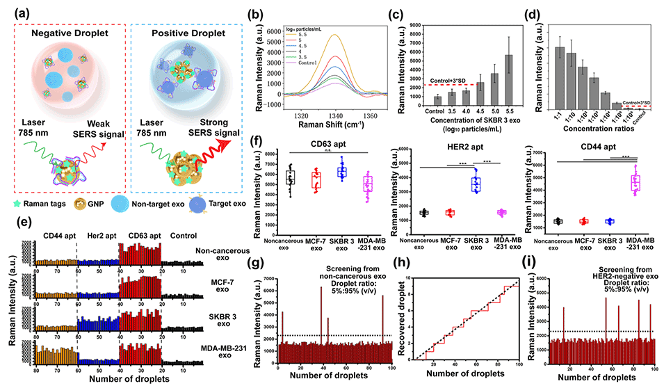 1、开发了一种基于表面增强拉曼光谱(SERS)的液滴微流控平台,用于快速、灵敏地检测乳腺癌细胞来源的HER2阳性外泌体。