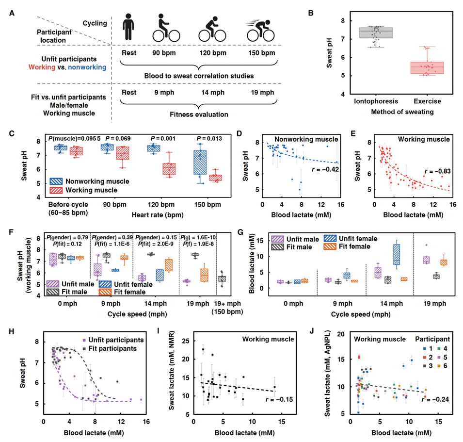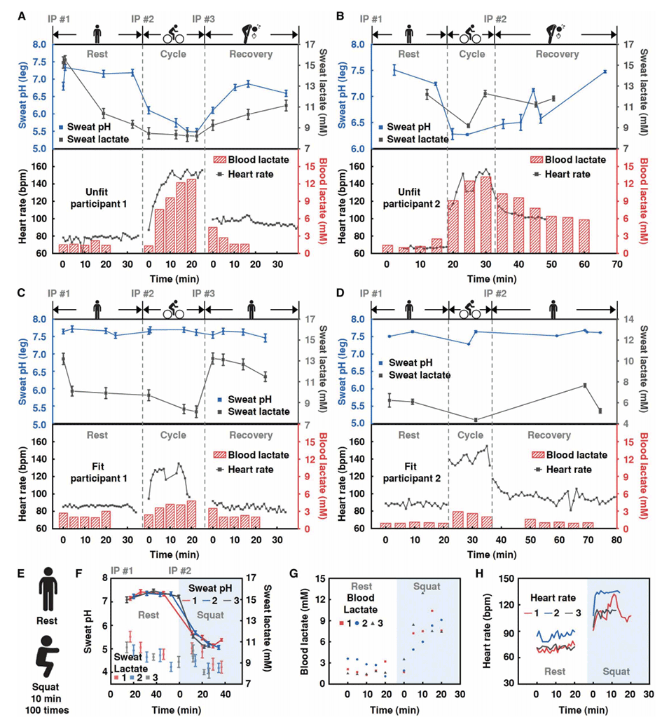 图5.在不同运动强度、采样位置和健身频率下评估汗液pH值和汗液乳酸,以监测个人健康状况。