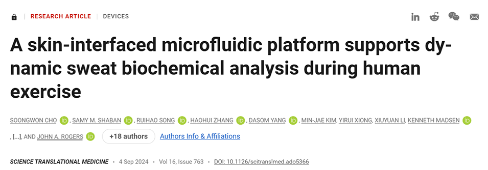 近期,有研究人员开发了一种集成了比色计时器和生化检测装置的可穿戴微流控带,用于在不同运动强度下实时捕获汗液并测量pH值和乳酸浓度,为评估个人体能状况和肌肉疲劳程度提供了一种简单、无创的新方法。相关研究以“A skin-interfaced microfluidic platform supports dynamic sweat biochemical analysis during human exercise”为题目,发表在期刊《Science Translational Medicine》上。