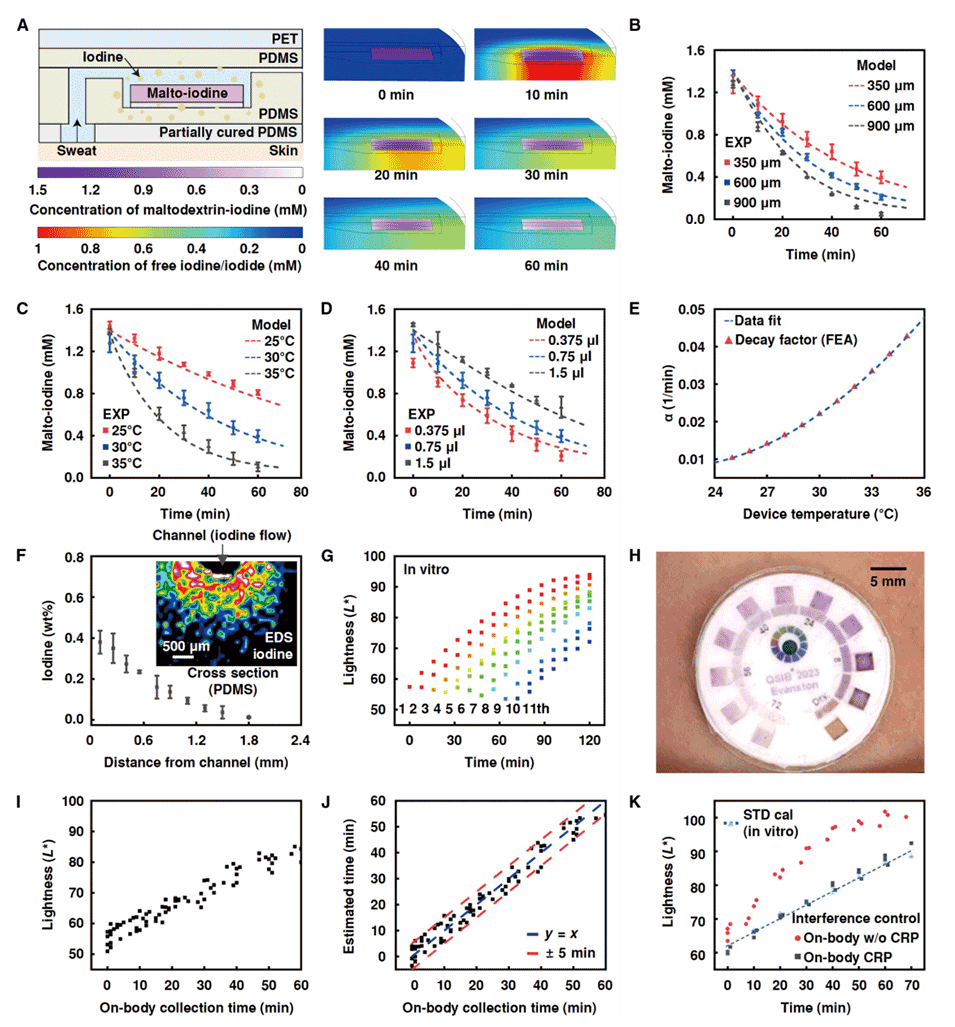 图6.使用带比色计时器的多功能汗液微流控装置进行实时运动汗液生理学研究。