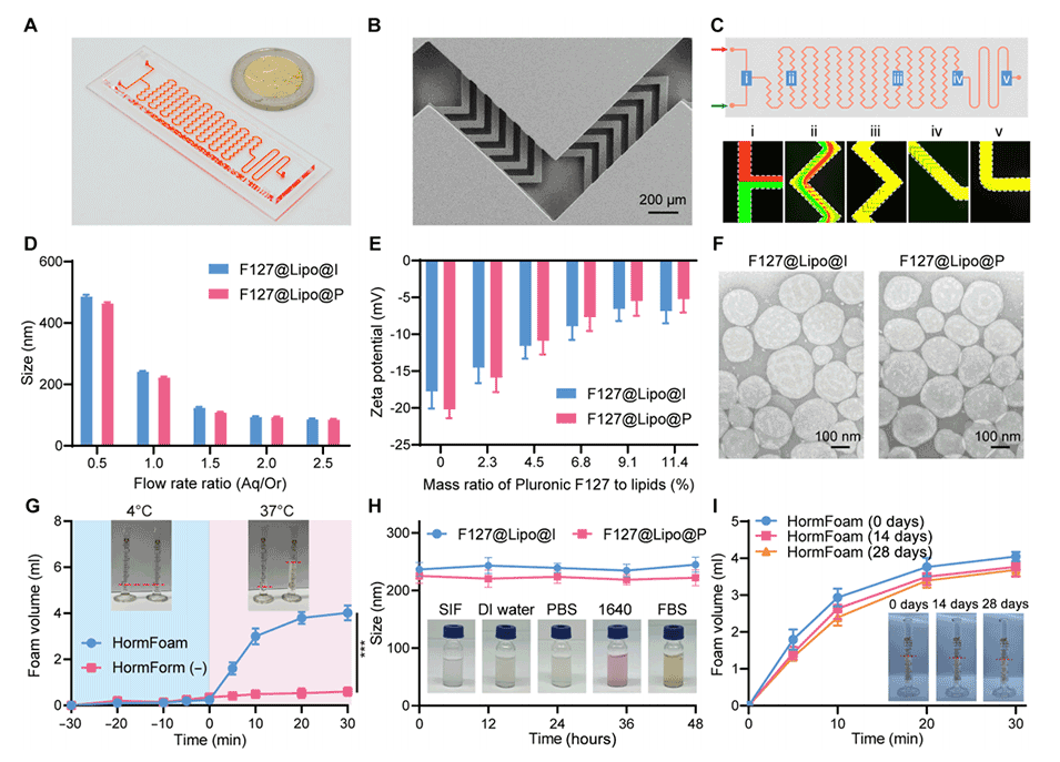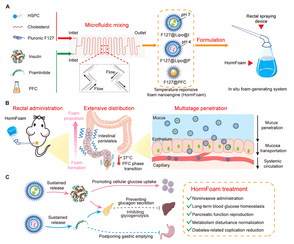 近期,南京理工大学罗军教授、南京大学宋玉君教授、南京大学/皖南医学院高彦峰博士和南京理工大学张宇博士合作,采用微流控技术制备了一种新型温度响应性双激素泡沫纳米引擎(HormFoam),并与定制的喷雾装置结合,用于改善直肠给药胰岛素和普兰林肽(一种胰淀素类似物)的生物利用度,以治疗糖尿病。相关研究以“A temperature-responsive dual-hormone foam nanoengine improves rectal absorptivity of insulin-pramlintide for diabetes treatment”为题目,发表在期刊《Science Advances》上。