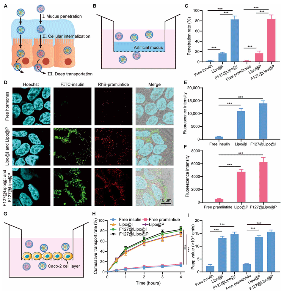 HormFoam独特的尺寸和Pluronic F127功能化修饰使其能够有效克服肠道的粘液和黏膜屏障,实现胰岛素和普兰林肽的有效输送。