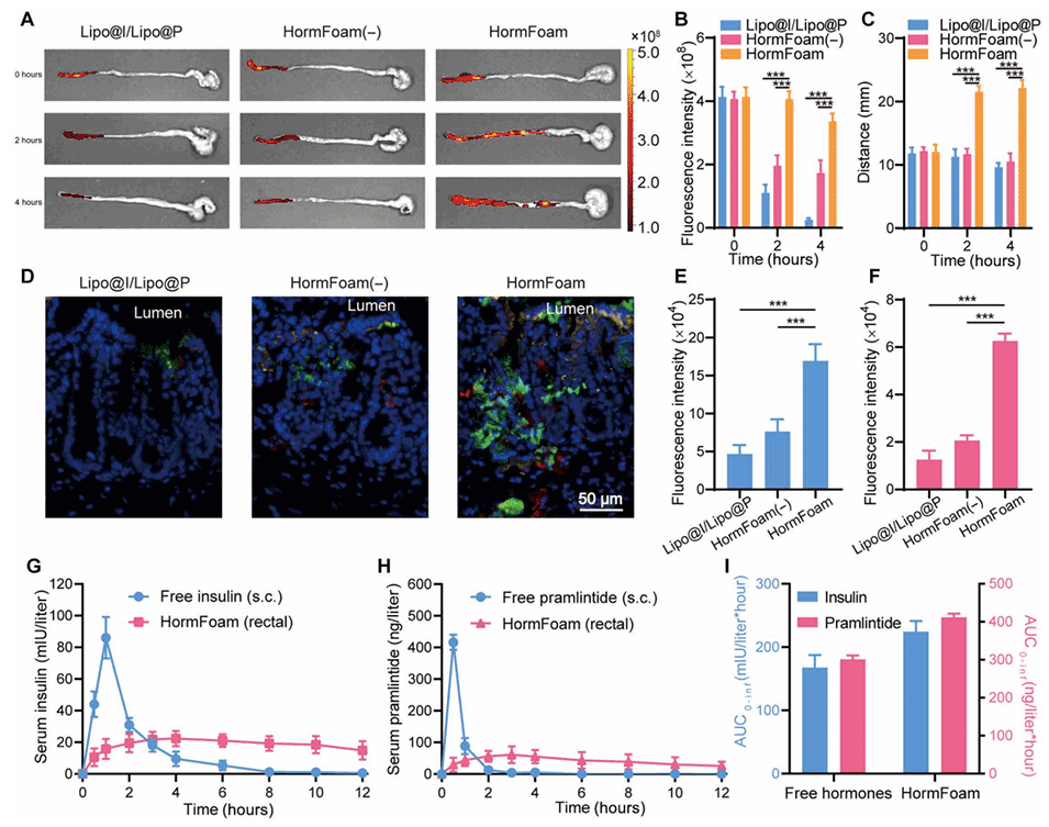 3、HormFoam可以在生理温度下持续产生泡沫,推动药物沿直肠前进,增强肠道分布和黏膜吸收,实现胰岛素和普兰林肽的有效共递送。