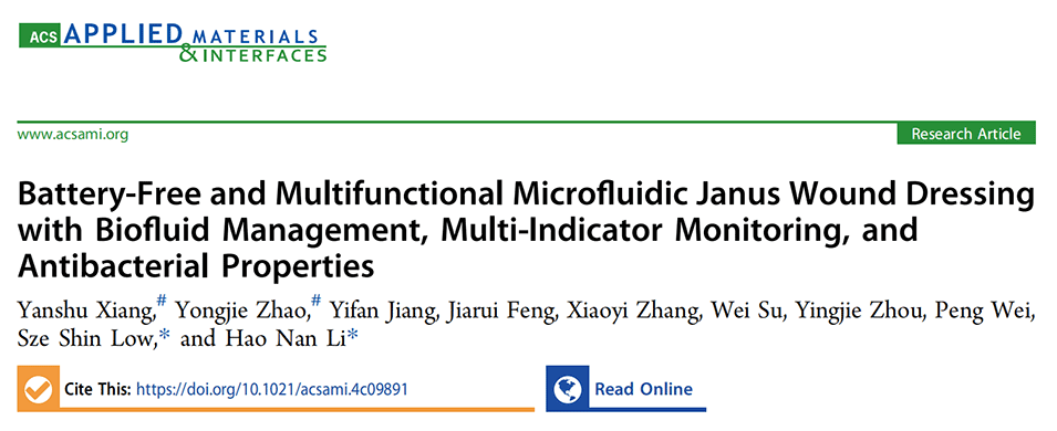 慢性伤口的复杂环境,以长期渗出和反复的细菌感染为特征,给伤口恢复带来了重大挑战。多功能伤口敷料的最新进展不足以提供全面、准确和舒适的治疗。为了解决这些问题,宁波诺丁汉大学李灏楠、刘子欣等人提出了一种新型无电池、多功能微流控Janus伤口敷料(MM-JWD),它能够有效管理伤口渗液、监测多种感染指标,并具备抗菌功能,旨在为慢性伤口治疗提供全面、准确和舒适的护理方案。相关研究以“Battery-Free and Multifunctional Microfluidic Janus Wound Dressing with Biofluid Management, Multi-Indicator Monitoring, and Antibacterial Properties”为题目,发表在期刊《ACS Applied Materials & Interfaces》上。