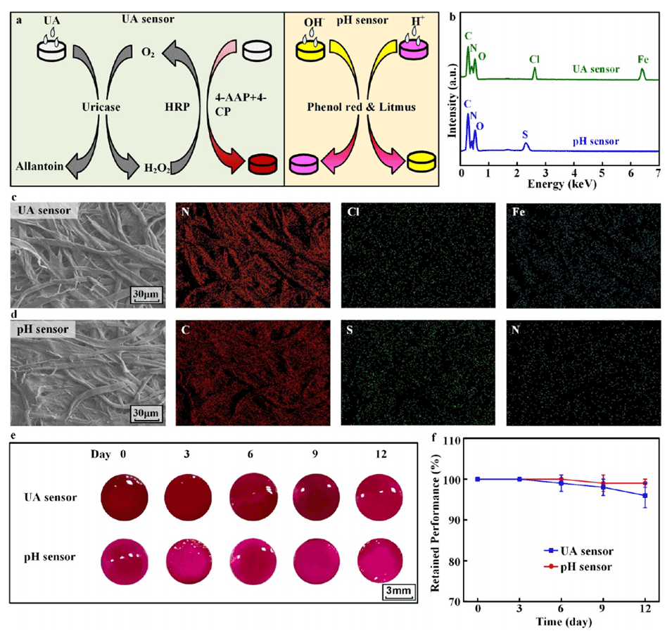 1、比色传感器设计:比色传感器由特定的化学物质组成,这些物质对pH、尿酸和温度的变化较为敏感,其颜色也会随之发生变化。