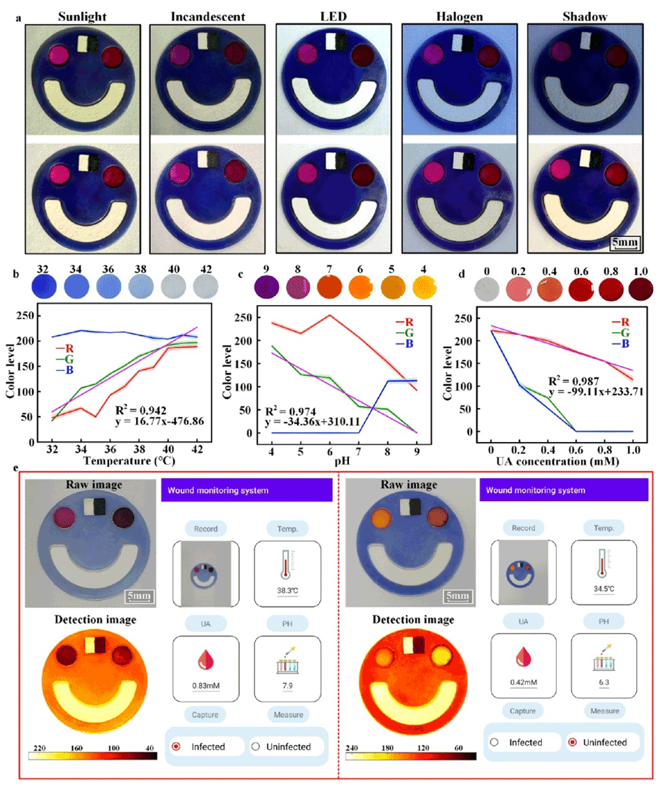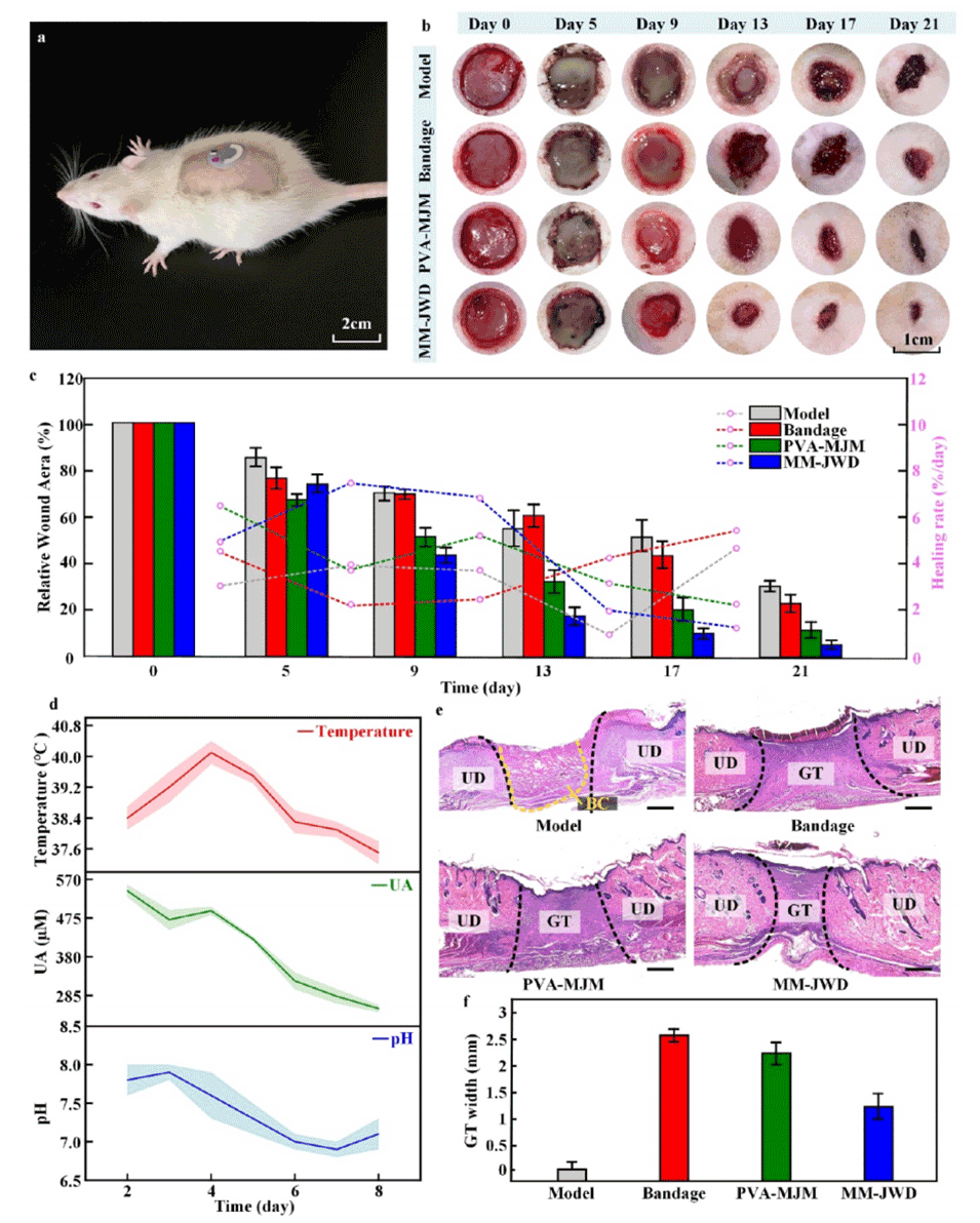 通过这些技术手段,MM-JWD能够实现对伤口pH、尿酸和温度的准确检测,为慢性伤口的监测和治疗提供科学依据。