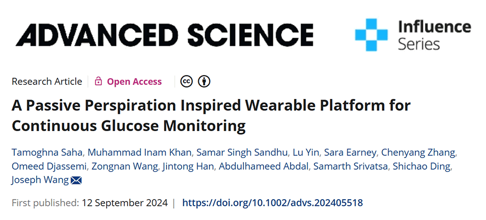 近期,加州大学圣地亚哥分校Joseph Wang教授团队开发了一种新型被动式汗液血糖监测系统,该系统能够在无需刺激排汗的情况下,通过一种可穿戴于皮肤上的贴片实现对血糖水平的实时监测。这一系统采用了渗透驱动的水凝胶来提取汗液,利用纸微流控通道进行汗液传输,并结合自供能的酶生化传感器来监测葡萄糖浓度。相关研究以“A Passive Perspiration Inspired Wearable Platform for Continuous Glucose Monitoring”为题目发表于期刊《Advanced Science》。