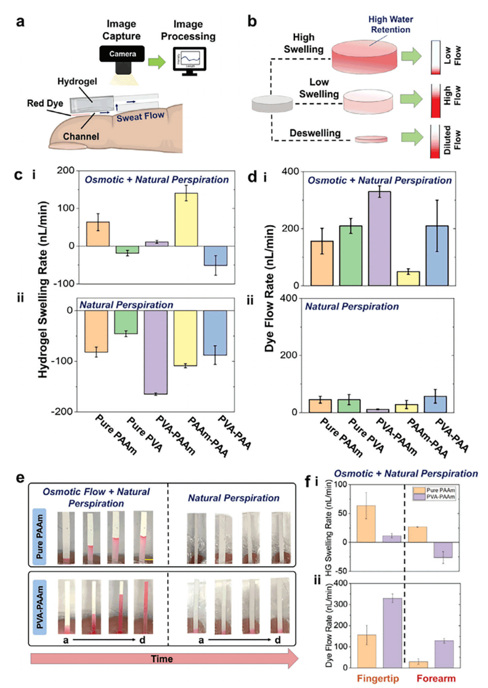图2.评估水凝胶在皮肤上持续提取汗液的性能。