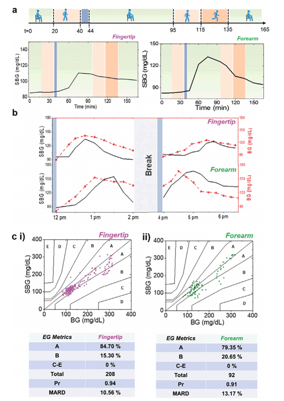 4、在指尖和前臂进行了测试,并开发了个性化校准模型,以从汗液中获取实时血糖信息。