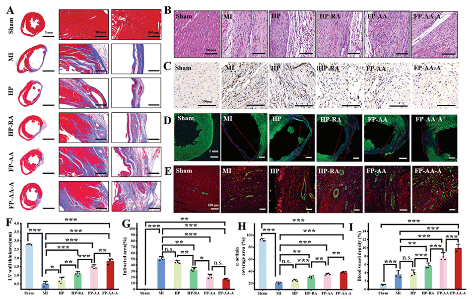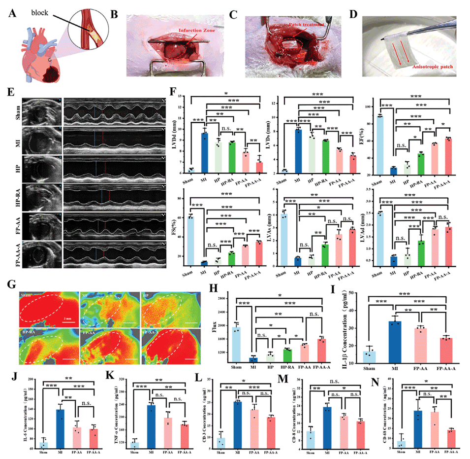 图5.心肌梗死后植入各向异性贴片及其对心功能恢复的治疗效果。