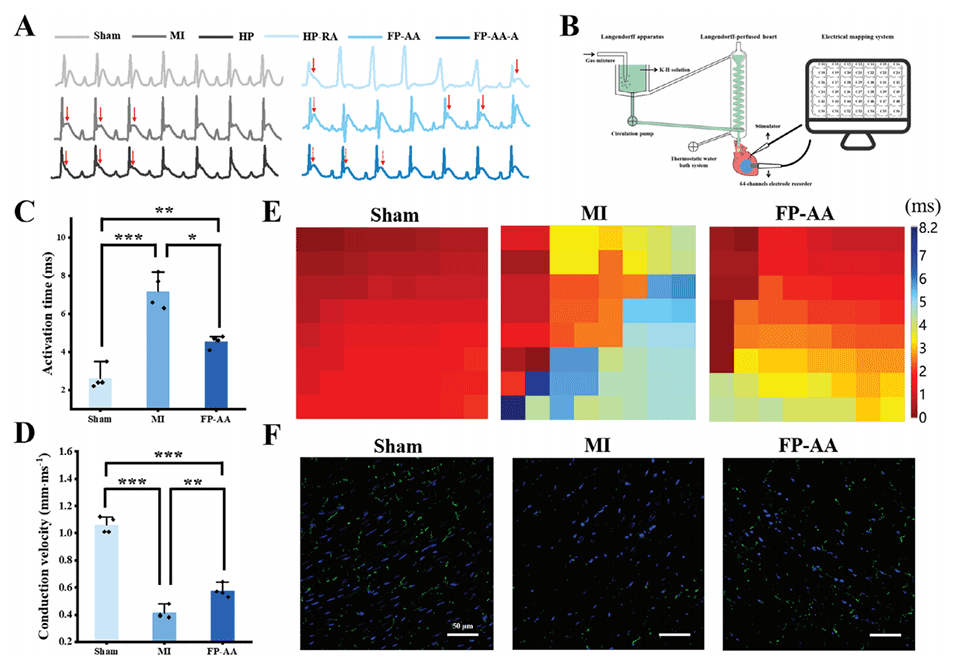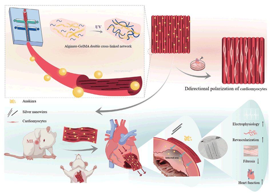 心肌梗死是一种由冠状动脉突然阻塞引起的严重心血管疾病,常导致电信号传导异常、心室重塑和纤维化等不良后果。尽管传统的冠状动脉介入治疗在临床上广泛应用,但心肌再生能力受限降低了其治疗效果。根据其他器官修复再生方面的进展可知,组织工程策略已被证明是一种心脏组织再生的潜在方法。