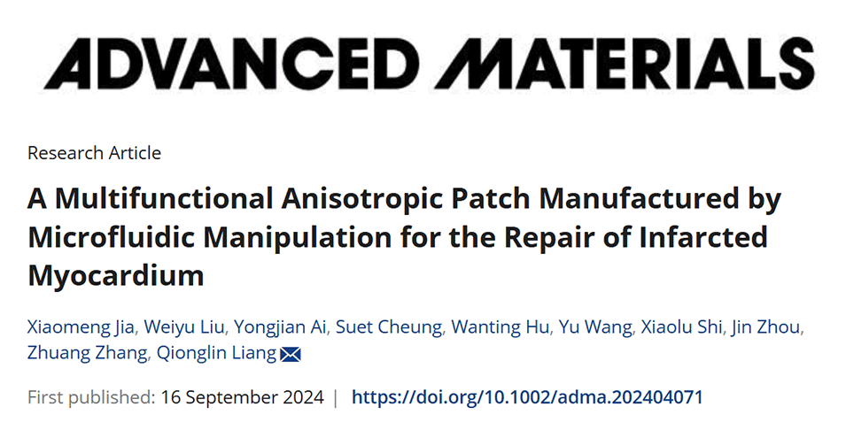 近期,清华大学化学系梁琼麟教授团队开发了一种基于微流控技术的多功能各向异性水凝胶贴片,用于修复心肌梗死,该贴片能够模拟心肌的各向异性,引导心肌细胞定向极化,并在动物模型中显著抑制心室重塑和纤维化,促进心脏功能恢复。相关研究以“A Multifunctional Anisotropic Patch Manufactured by Microfluidic Manipulation for the Repair of Infarcted Myocardium”为题目,发表在期刊《Advanced Materials》上。