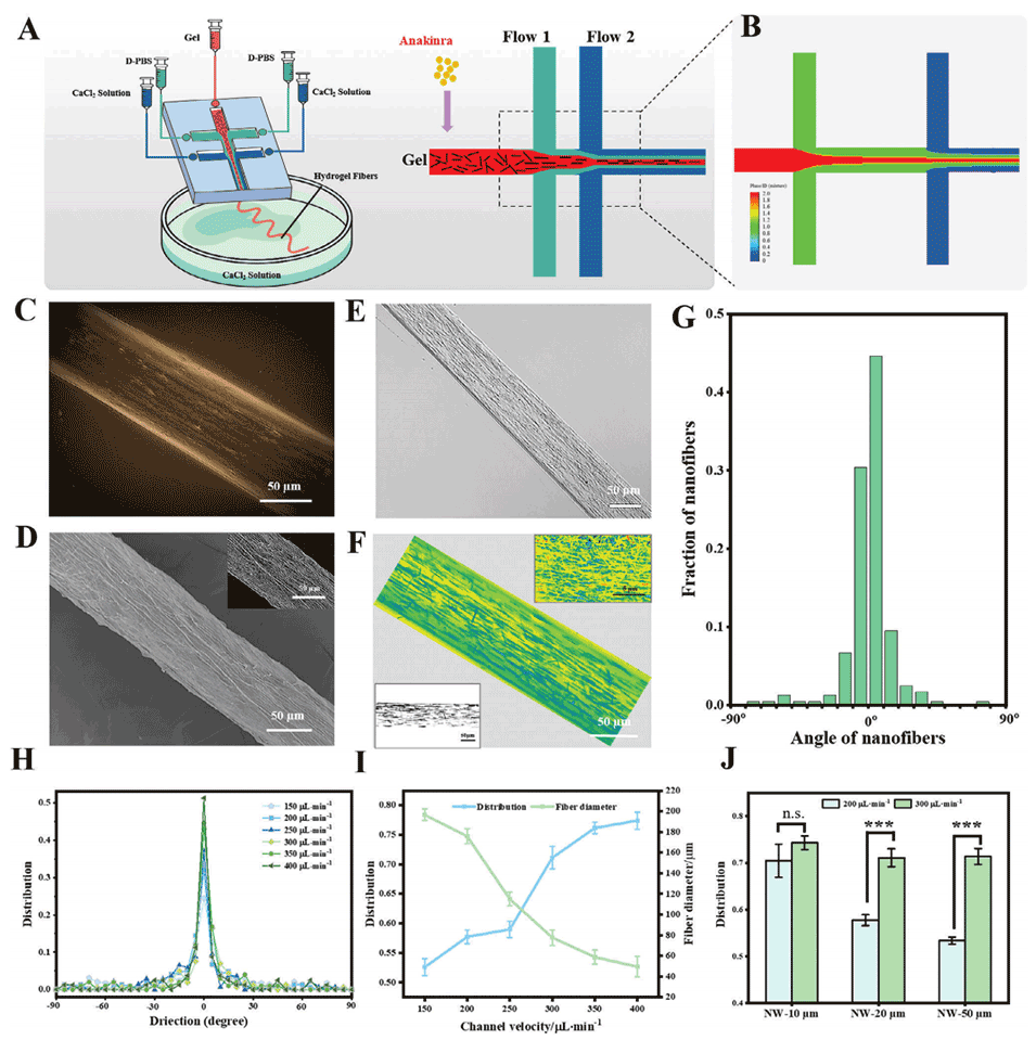 3、流体聚焦与交联:通过两侧通道分别注入不含钙的D-PBS和低浓度的CaCl2溶液,利用流体动力学产生的剪切流对齐中间通道中的银纳米线。Ca2+与海藻酸盐反应,交联形成具有一定方向性的水凝胶纤维。