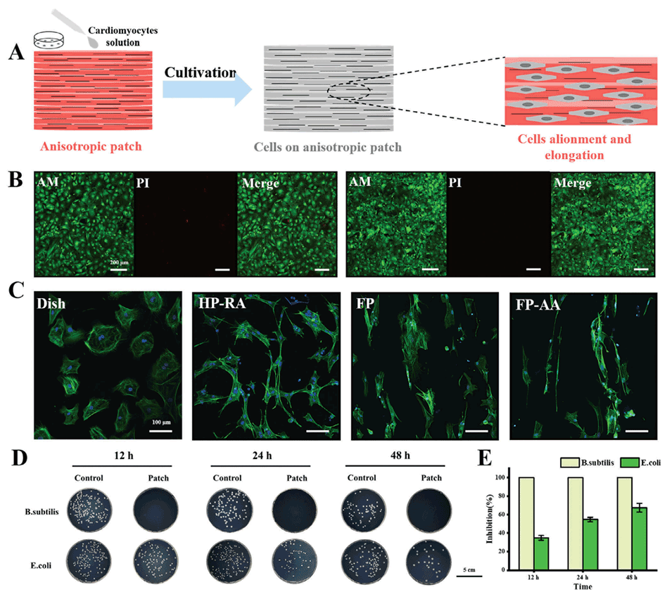 图4.各向异性心肌贴片引导心肌细胞定向生长及其抗菌功能。