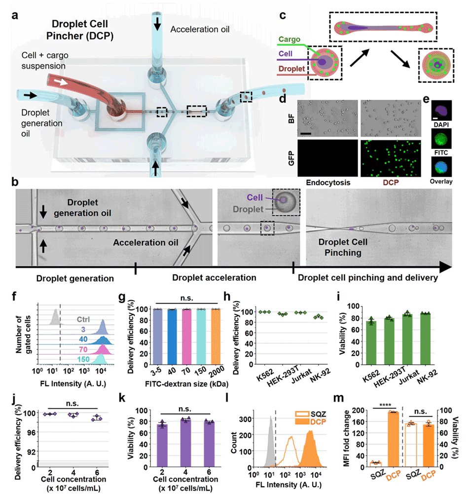1、开发了一种名为“液滴细胞钳(DCP)”的微流控基因传递系统,该系统将微流控技术与细胞机械穿孔相结合,能够高效且安全地进行基因组编辑。