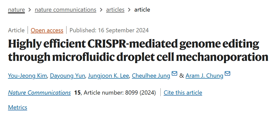 近期,有研究人员开发了一种名为“液滴细胞钳(DCP)”的微流控基因传递系统,用于高效且安全地进行CRISPR介导的基因组编辑。该系统将液滴微流控与细胞机械穿孔相结合,通过微尺度收缩实现细胞和CRISPR系统的封装和受控通过,从而在细胞膜和核膜上产生不连续性,促进CRISPR系统快速内化到细胞核中。相关研究以“Highly efficient CRISPR-mediated genome editing through microfluidic droplet cell mechanoporation”为题目发表于期刊《Nature Communications》。
