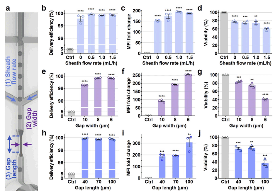 图2.在不同操作流速和几何条件下将2000kDa FITC-葡聚糖递送至K562细胞的传递特性表征。
