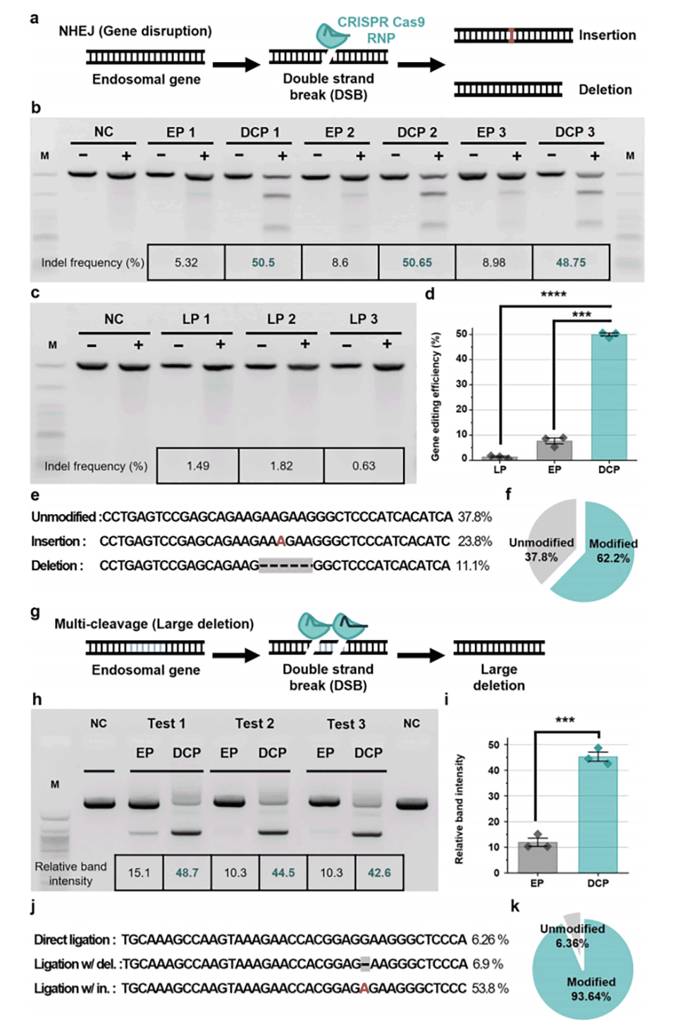 图4.通过将CRISPR-Cas9核糖核蛋白(RNP)递送至K562细胞进行各种基因组编辑,随后通过NHEJ途径对目标位点的编辑效率进行表征。