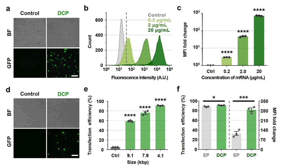 图3.利用DCP平台进行mRNA和质粒DNA细胞转染。