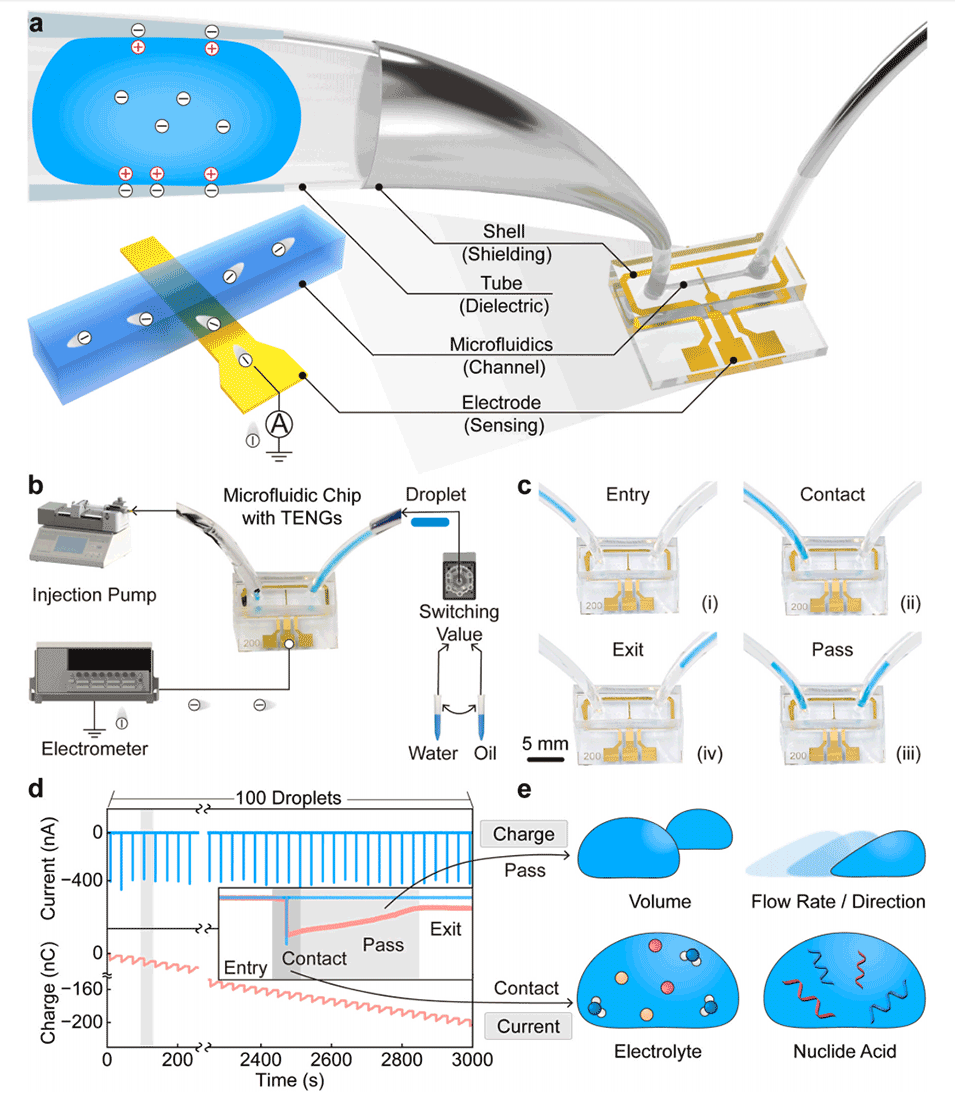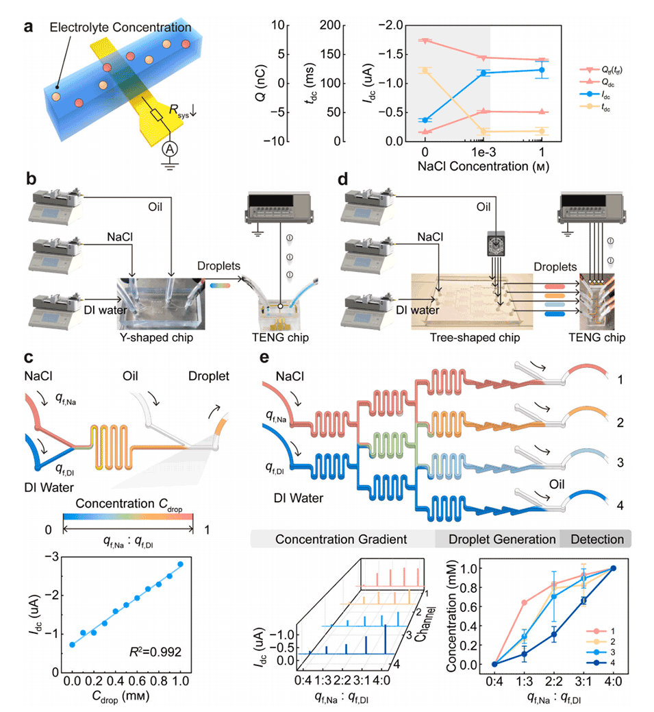 4、化学和生物分析:TENG技术能够用于检测微滴中的电解质浓度和特定生物分子,如核酸,从而在化学和生物分析领域具有潜在的应用价值。