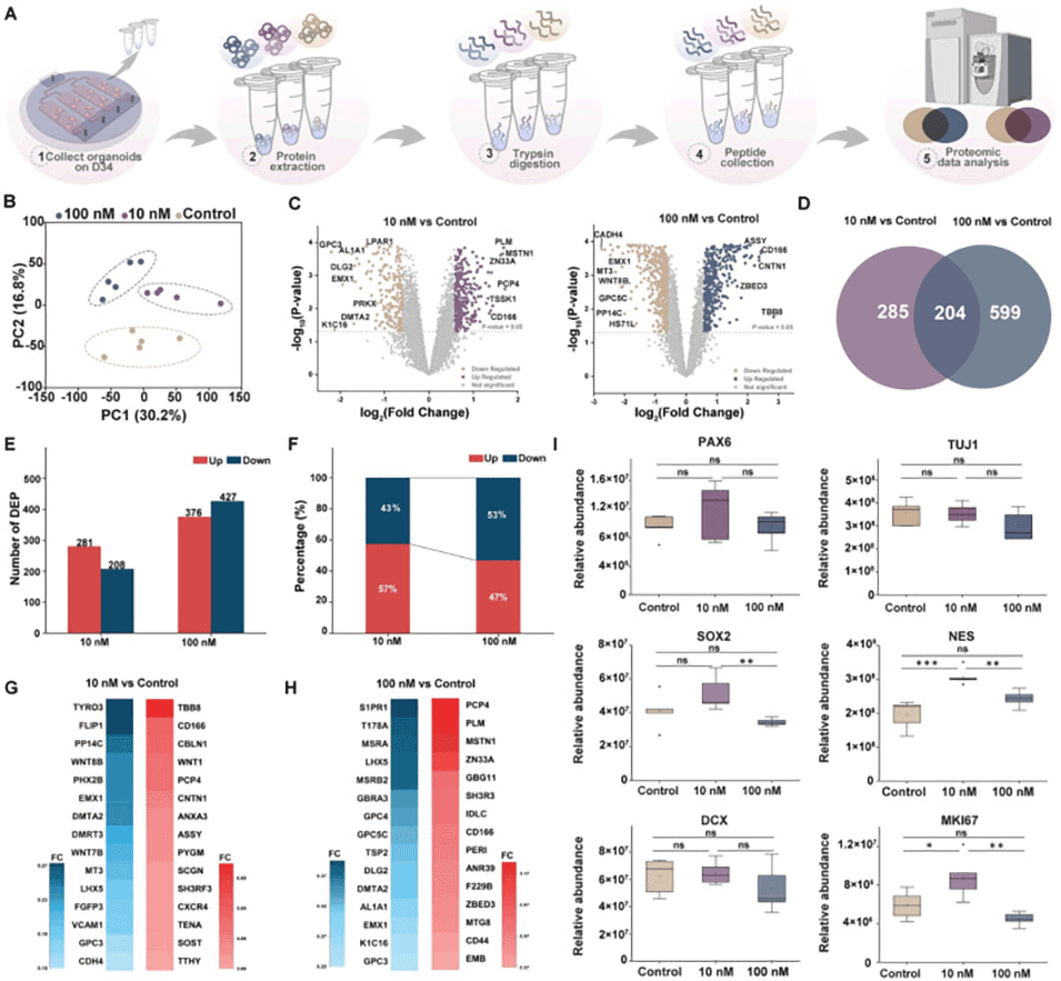 图3.在三种不同浓度下培养的脑类器官的蛋白质组学分析。