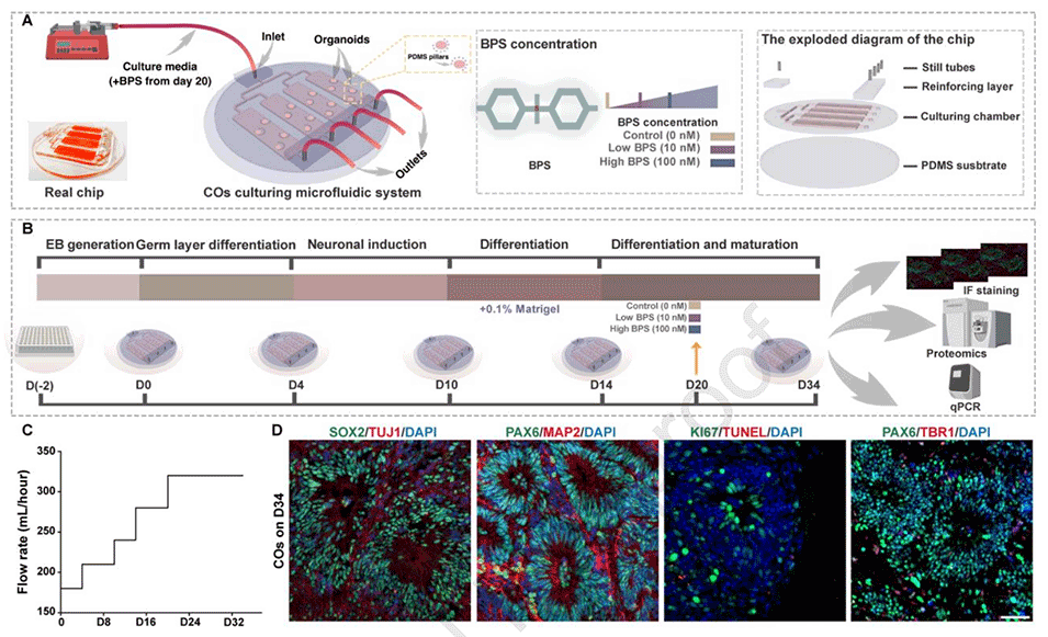 通过调整入口处的流速,可以实现对BPS的恒定浓度暴露。在实验中,从培养的第20天开始,对脑类器官进行为期14天的不同剂量BPS(10nM和100nM)暴露,以模拟持续的环境暴露。通过这种方法,研究人员能够有效评估BPS对脑类器官神经发育的影响。