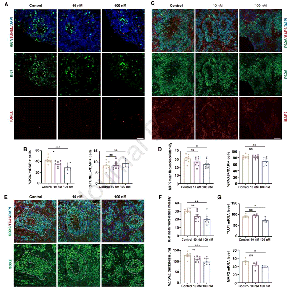 2、研究发现,双酚S暴露会抑制大脑器官中神经元的分化,并且呈现剂量依赖性。