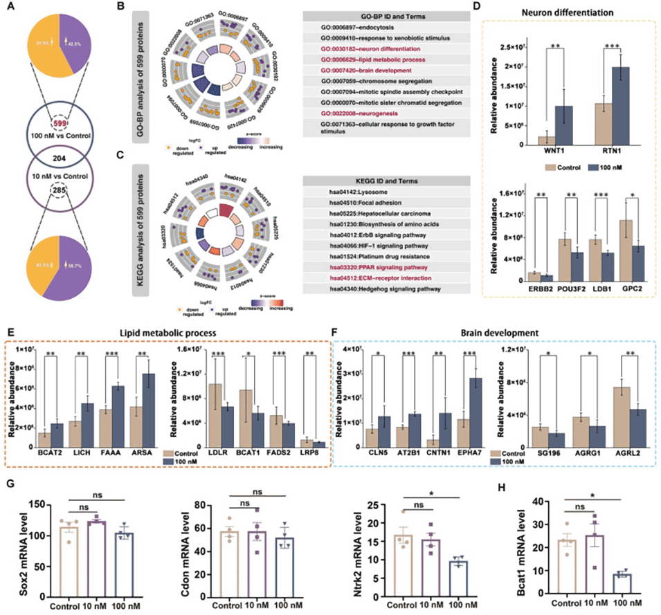 图4.蛋白质组学分析显示100nM BPS暴露对脑类器官造成的异常,包括神经元分化、脂质代谢和脑发育。