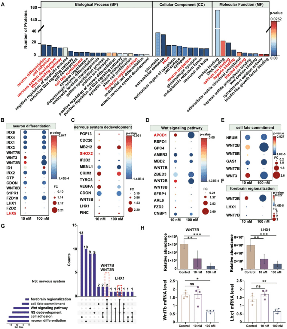 3、蛋白质组学分析表明,双酚S暴露会抑制Wnt信号通路,并导致大脑区域化相关信号分子表达的改变。