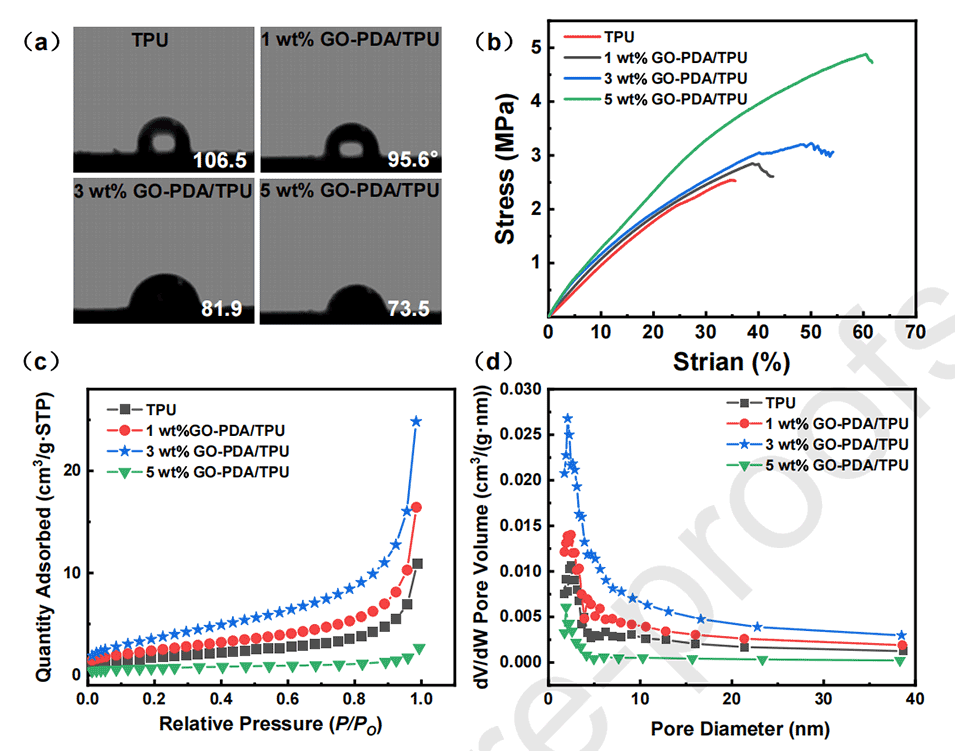 图5.展示了GO-PDA/TPU纤维膜的亲水性、热稳定性、机械性能和孔隙结构。(a)不同GO-PDA含量的GO-PDA/TPU纤维膜的水接触角。(b)不同GO-PDA含量的GO-PDA/TPU纤维膜的应力-应变曲线。(c)不同GO-PDA含量的GO-PDA/TPU纤维膜的氮气吸附-脱附曲线。(d)不同GO-PDA含量的GO-PDA/TPU纤维膜的孔径分布。